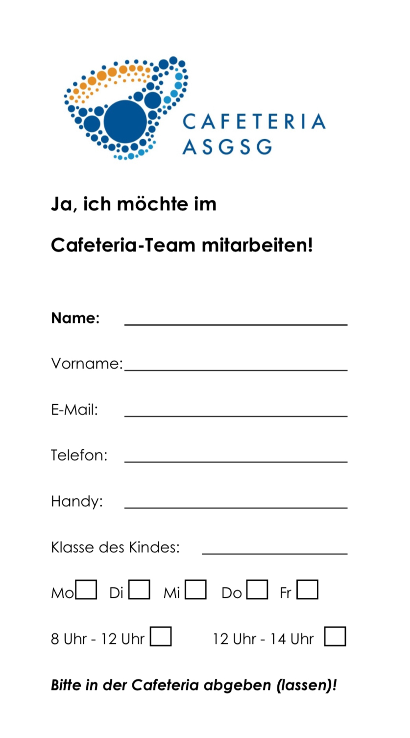 Sind Sie neugierig geworden oder möchten Sie einfach mal einen Probedienst in der Schulcafeteria mitmachen? Dann schreiben Sie eine Nachricht an cafeteria [at] asgsg.nrw.schule.